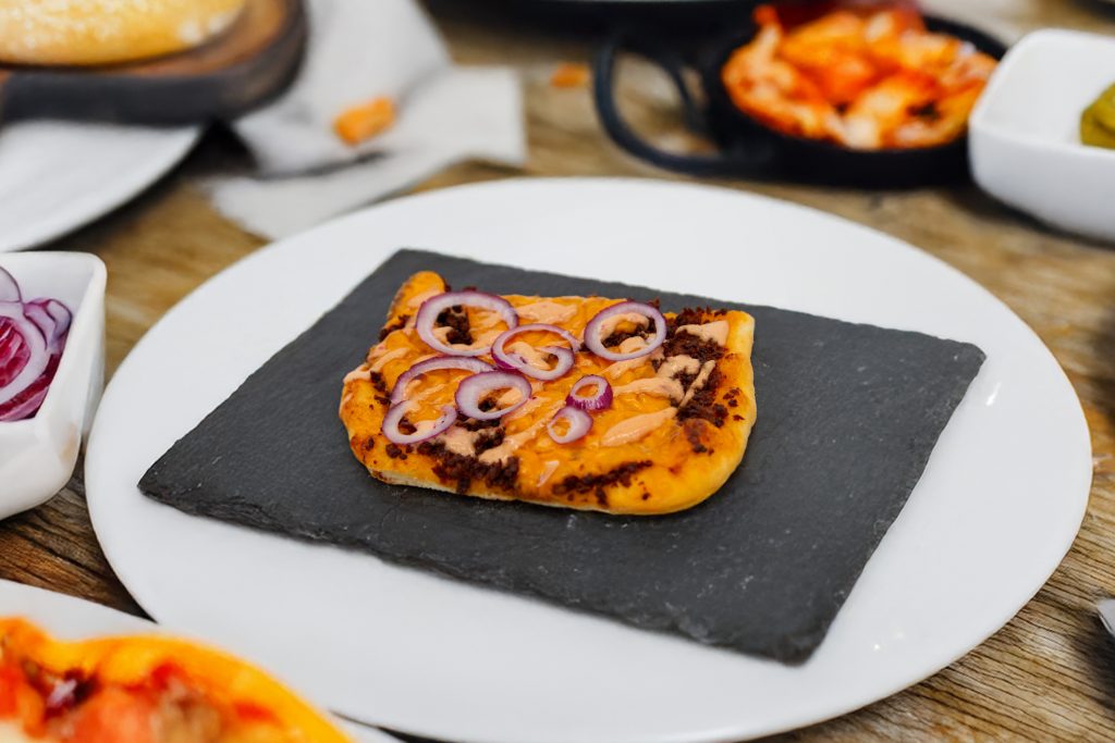 Wer mag, garniert mit frischen Zwiebelringen für den perfekten Burger-Touch.