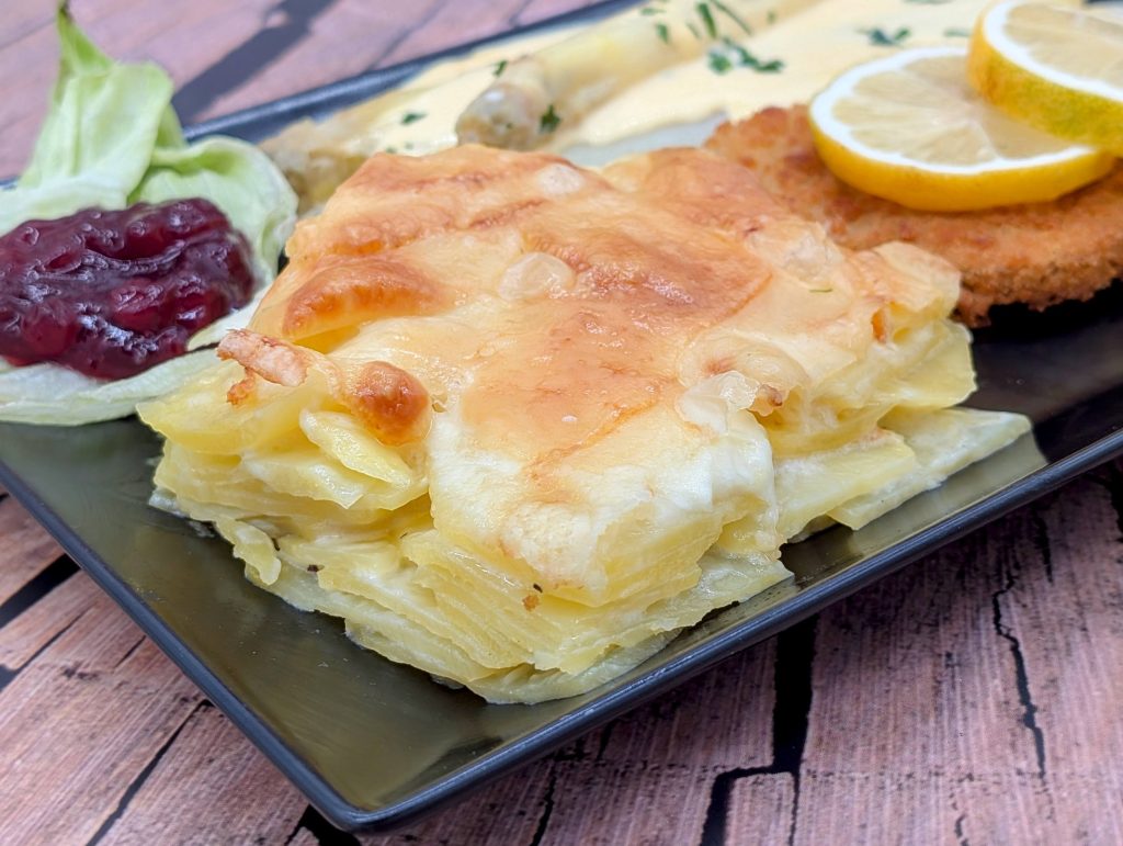 Je nach Dicke der Kartoffelscheiben das Gratin nochmals etwa 20 Minuten backen.