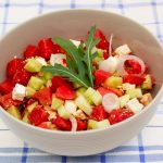 Die restlichen Kartoffeln und Auberginen darüber schichten, übrigen Feta darüber bröseln.