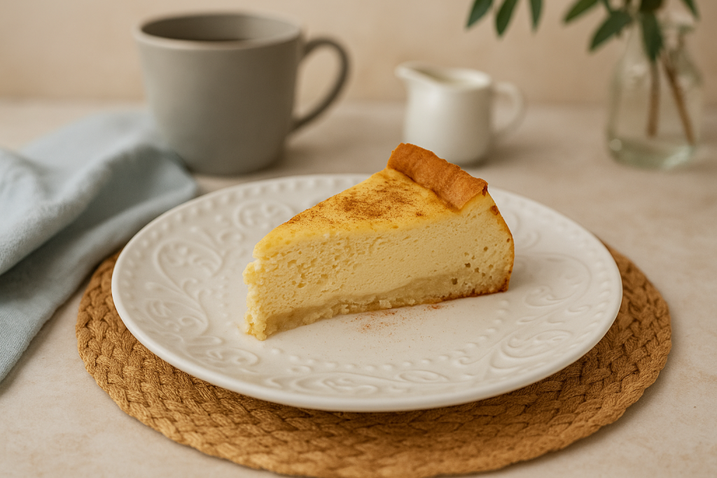 Die Creme auf den vorbereiteten Teig gießen und den Kuchen im vorgeheizten Backofen bei 180 °C (Ober-/Unterhitze) etwa 50 Minuten backen. Keine Sorge, wenn er direkt nach dem Backen noch etwas wackelig wirkt – beim Abkühlen wird er fest.