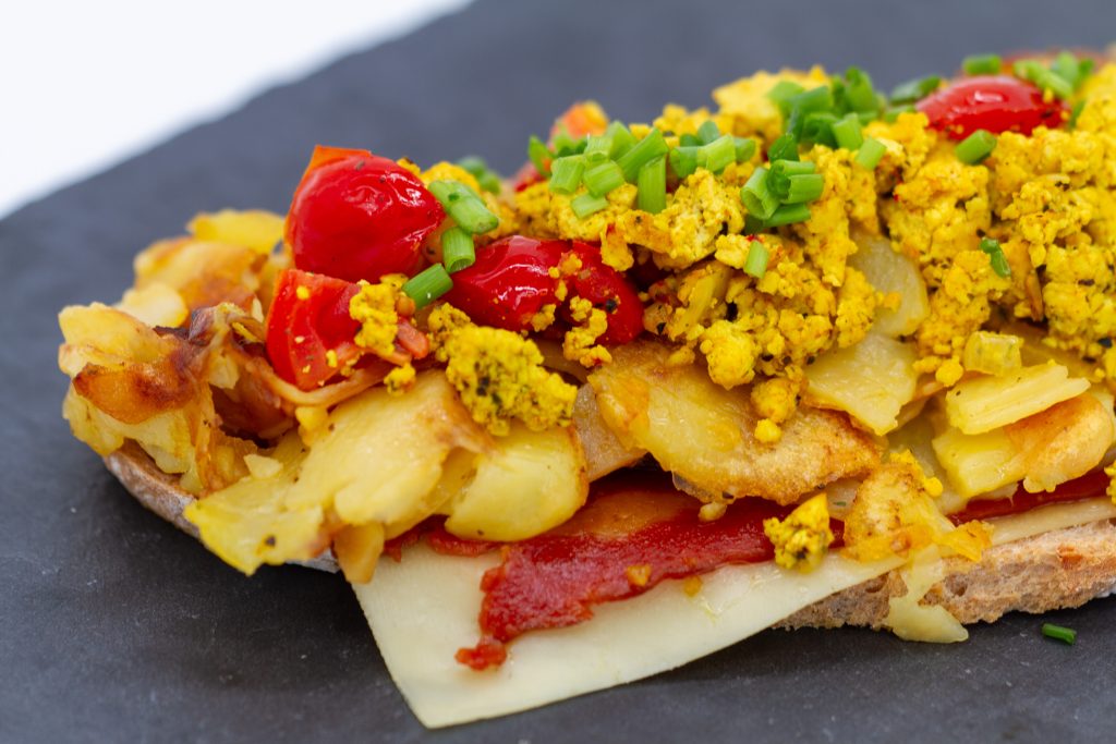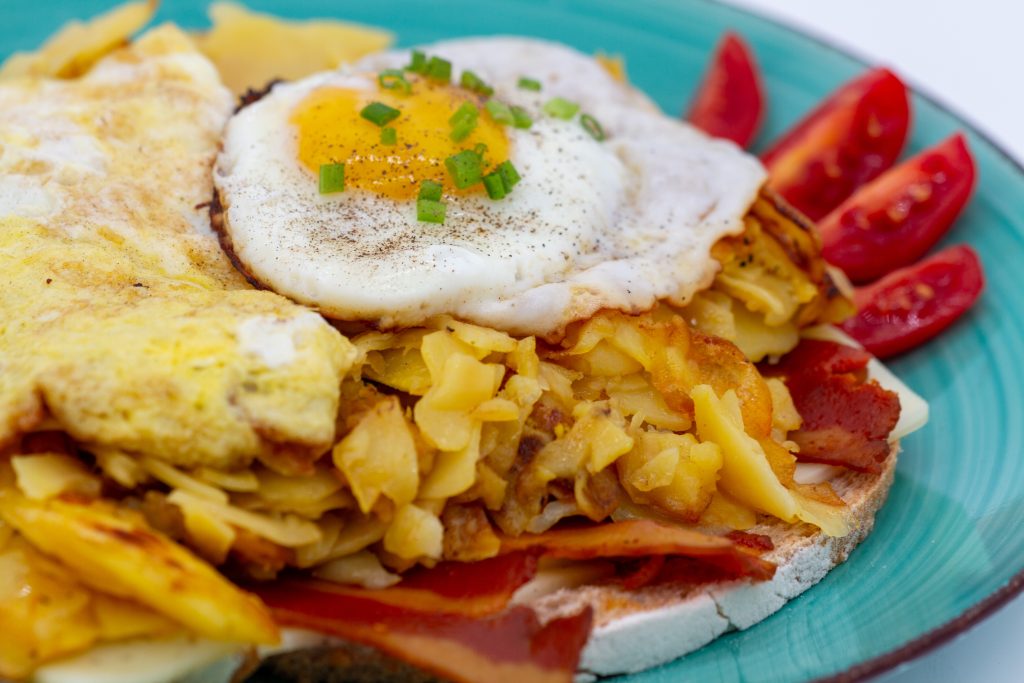 Brotscheiben mit Käse belegen, dann den heißen Speck darauflegen. Bratkartoffeln darüber verteilen, anschließend das Rührei (oder ein Spiegelei) obenauf geben.