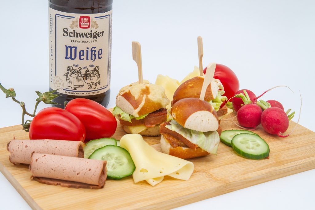 Käsescheiben in Stücke schneiden und auf den Leberkäs legen. Darauf die karamellisierten Zwiebeln geben und den Deckel daraufsetzen. Mit kleinen Holzstäbchen fixieren.